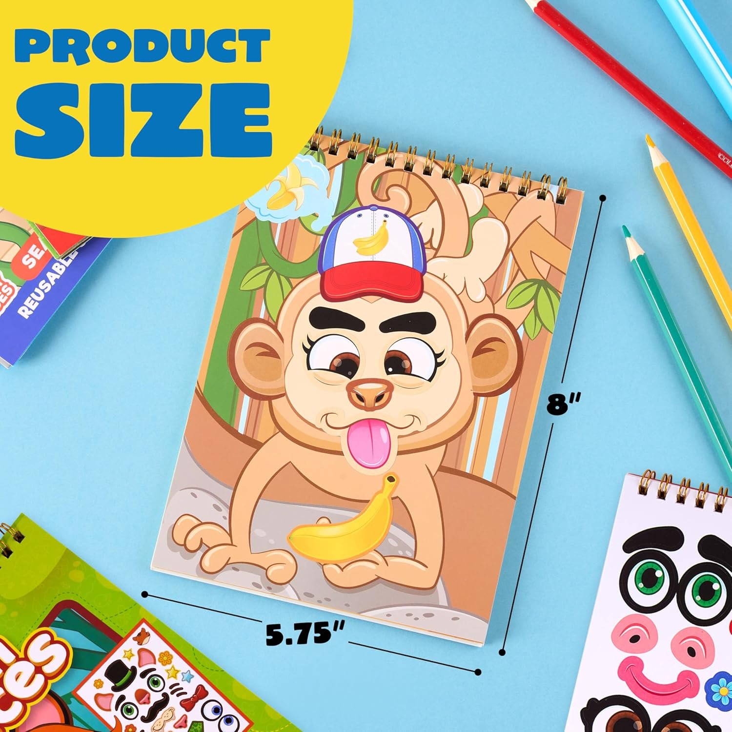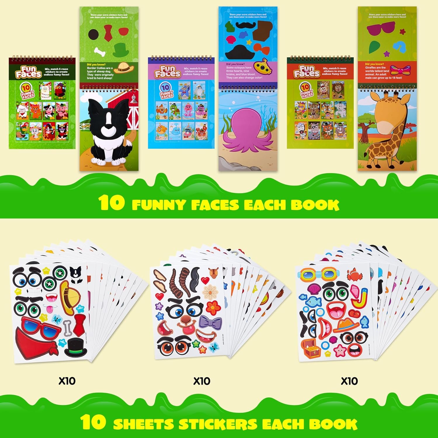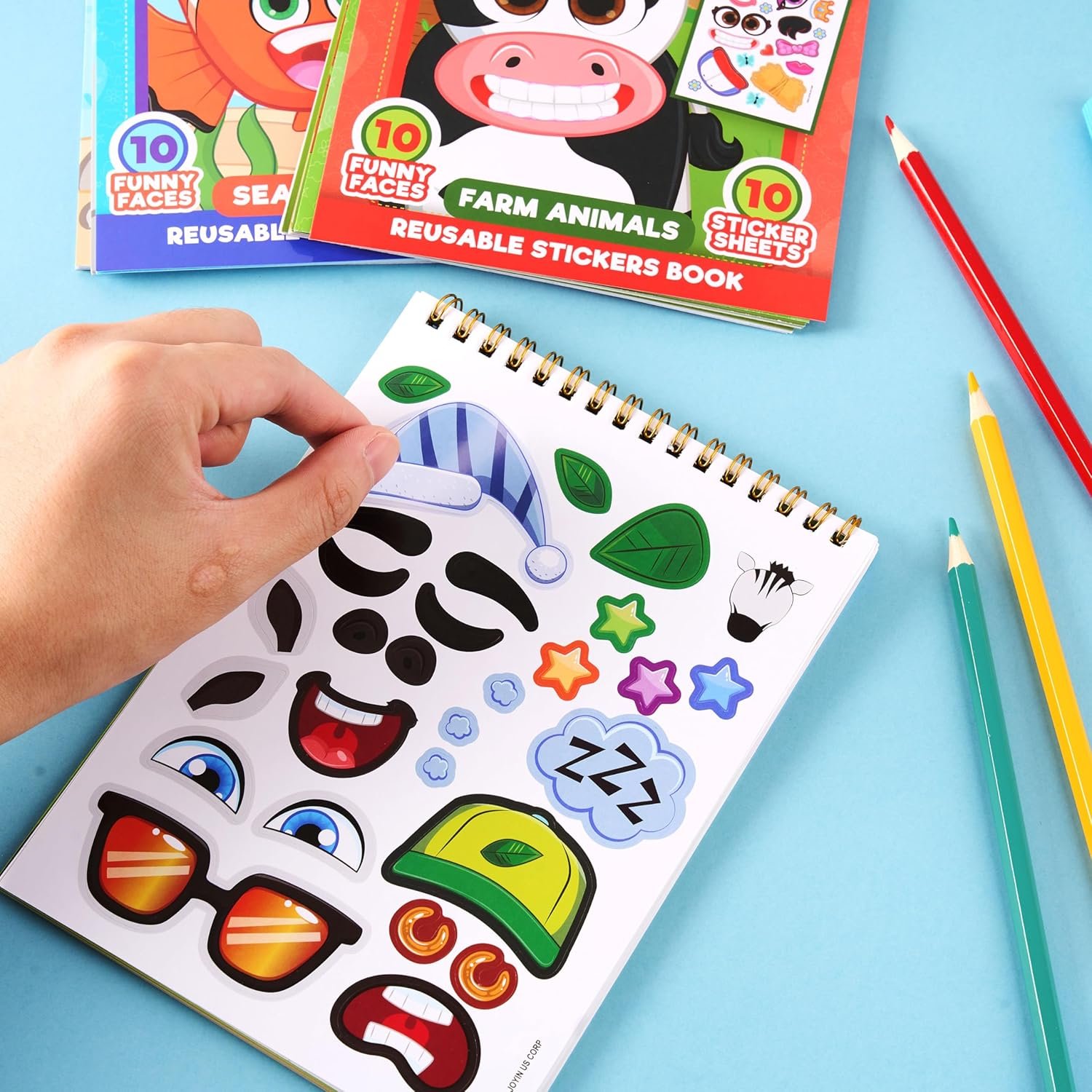 REUSABLE STICKER BOOKS:Each with 10 faces and 10 sheets of reusable cling stickers, providing hours of creative fun for your child.