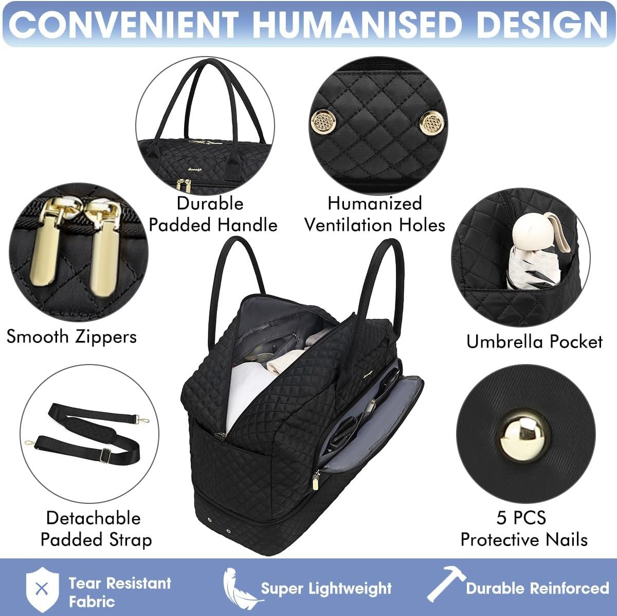Travel Tote Bag with Shoe Compartment: Separate flat bottom compartment of this women black bags can hold your shoes or dirty clothes for easy separation from clean clothes when traveling. Keeps you organized and takes the hassle out of packing. If you’re a novice mother, the bottom part is also perfect for storing diapers, wipes, diaper bag items. It can also be used as a hospital bag, mommy bag and medical bag