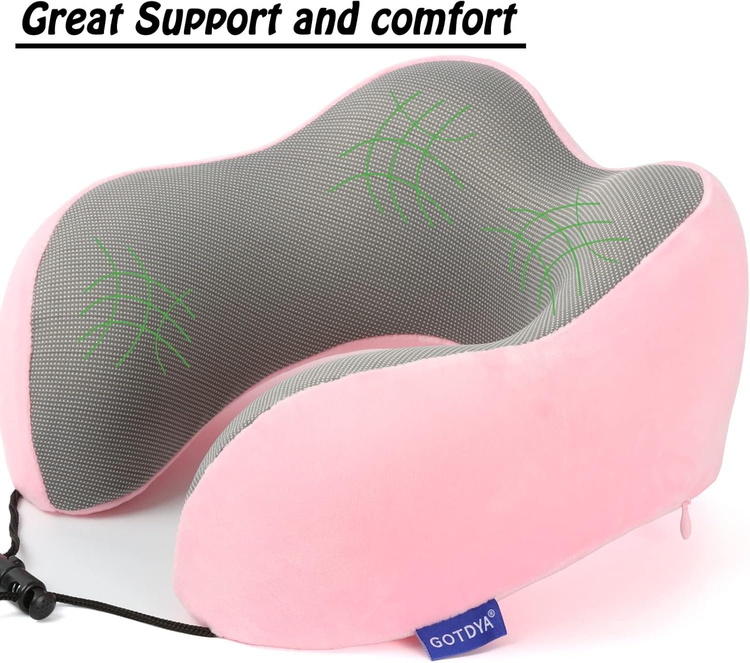 Travel Pillow,Travel Neck Pillows for Sleeping,100% Pure Memory Foam Soft Comfort & Support Pillow for Airplane/Car/Office&Home Rest Use-Pink
